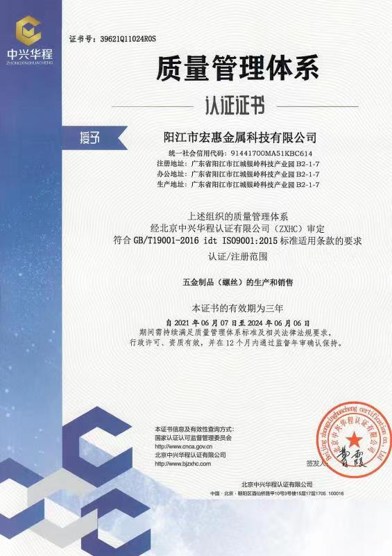 廣東宏惠金屬公司是家20多年一直專注鉆尾螺絲開發(fā)與生產(chǎn)的企業(yè),是國內(nèi)較早做鉆尾的廠家之一,同時也是國內(nèi)專業(yè)開發(fā)生產(chǎn)鉆尾螺絲的企業(yè)之一。 我司地址為于廣東省陽江市江銀嶺科技園距沈海高速白沙出口不到2公里,距陽江高鐵站也只有十余公里交通便利。 公司占地120畝,擁有超500臺套專業(yè)設(shè)計 生產(chǎn) 檢測設(shè)備。一個超200人的專業(yè)團(tuán)隊,能夠嚴(yán)格按照ISO9001質(zhì)量體系要求生產(chǎn)符合GB DIN AS3566 ANSI JIS BS等標(biāo)準(zhǔn)的產(chǎn)品,生產(chǎn)銷售各種高品質(zhì)緊固件系列產(chǎn)品,為中高端客戶提供優(yōu)質(zhì)服務(wù)。也可按照客戶要求設(shè)計生產(chǎn)各種鉆尾,年產(chǎn)高品質(zhì)碳鋼 不銹鋼鉆尾螺絲2萬余噸.在各大客戶的鼎力支持下產(chǎn)品暢銷全國,并遠(yuǎn)銷亞 非 拉 歐等地,在這20多年發(fā)展的道路上我司堅持“以質(zhì)量求生存,以信譽求發(fā)展”的精神理念不斷完善公司體系。